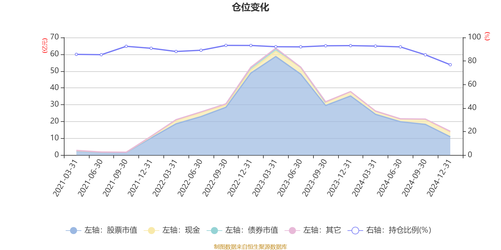 据定期报告数据统计,近三年平均股票仓位为90.07%,同类平均为87.94%。2022年三季度末基金达到93.29%的最高仓位,2024年末最低,为76.86%。