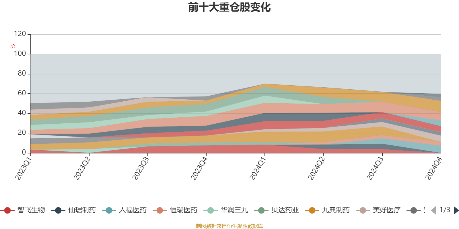 该基金持股集中度较高。截至2024年四季度末,基金十大重仓股分别是华海药业、百洋医药、人福医药、美好医疗、先声药业、阳光诺和、恒瑞医药、一心堂、金域医学、康弘药业。